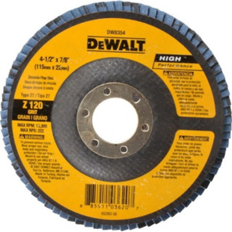 DeWALT 4-1/2″ 120 Grit 7/8″ Center Hole Type 27 Zirconia Alumina Flap Disc Fine Grade, Coated, Arbor Attachment, Fiberglass Backing, 13,300 RPM