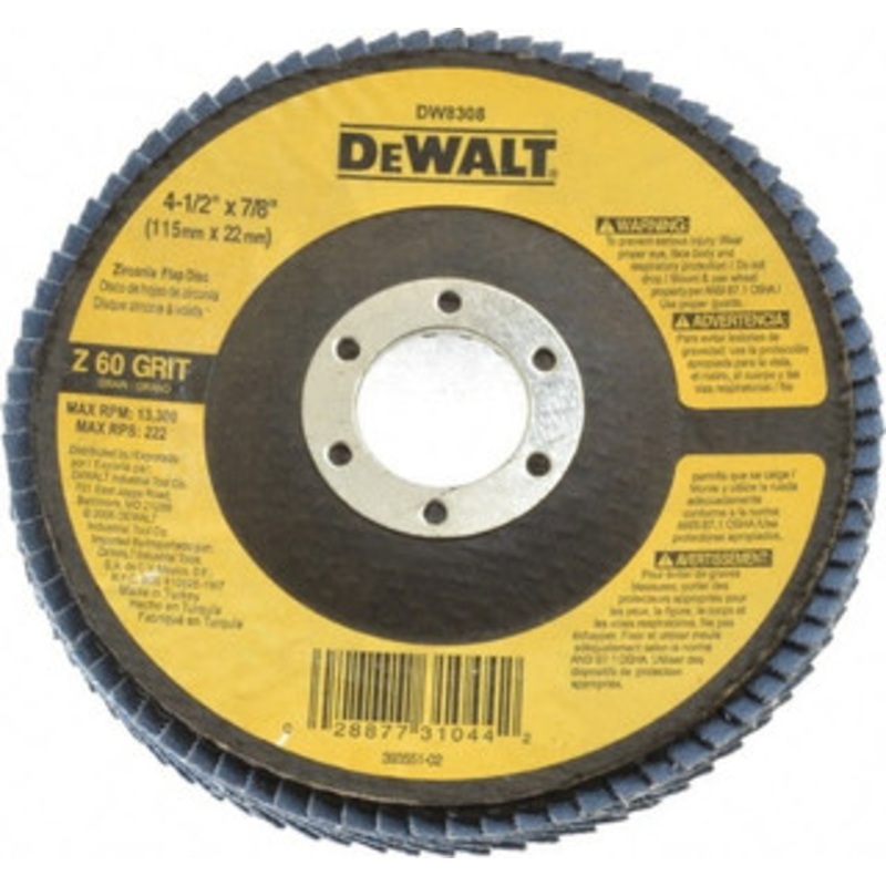 DeWALT 4-1/2" 60 Grit 7/8" Center Hole Type 29 Zirconia Alumina Flap Disc Medium Grade, Coated, Arbor Attachment, Fiberglass Backing, 13,300 RPMManufacturer Part #: DW8308S/N: 73201261UNSPSC: 31191506(Minimum Order Quantity=1, Package Quantity=1)Specificat