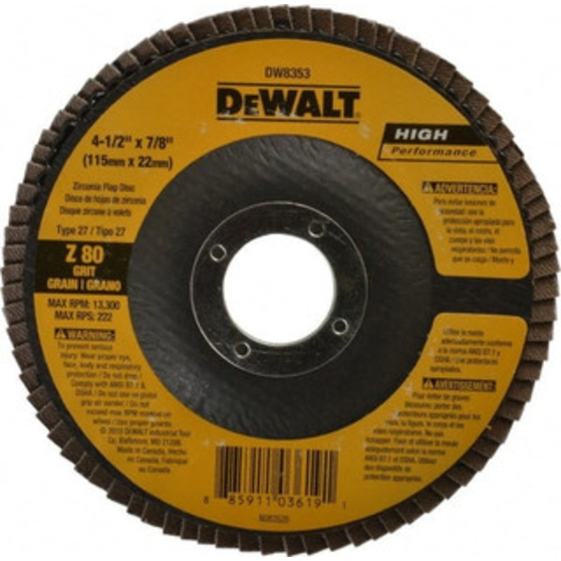 DeWALT 4-1/2″ 80 Grit 7/8″ Center Hole Type 27 Zirconia Alumina Flap Disc Medium Grade, Coated, Arbor Attachment, Fiberglass Backing, 13,300 RPM