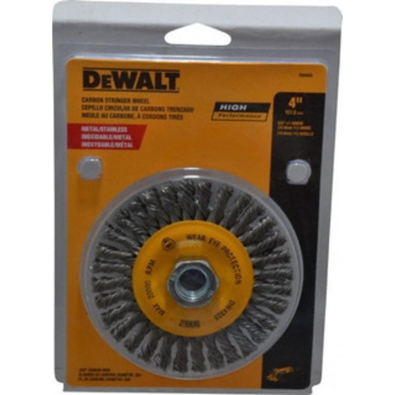 DeWALT 4" OD, 5/8-11 Arbor Hole, Knotted Steel Wheel Brush 0.02" Filament Diam, 20,000 RPMManufacturer Part #: DW4925S/N: 65052573UNSPSC: 31191521(Minimum Order Quantity=1, Package Quantity=1)Specifications:Mount TypeArbor HoleWire TypeStringer BeadOutside