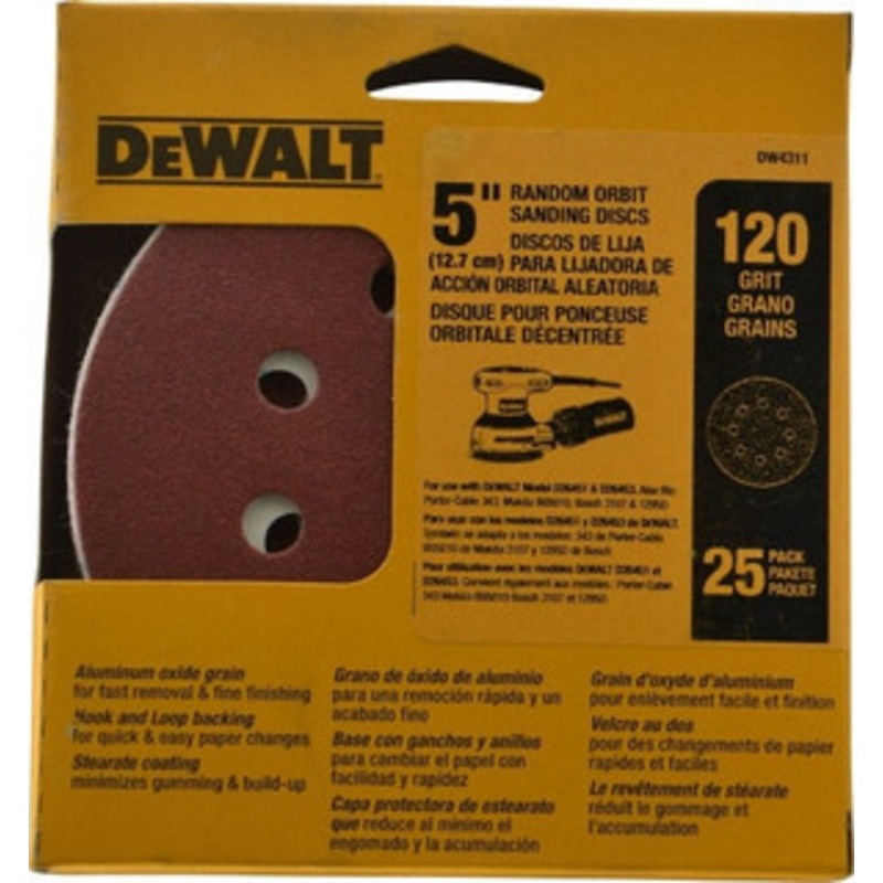 DeWALT 5" Diam, 120 Grit, Aluminum Oxide Hook & Loop Disc Fine Grade, Coated, Paper Backing,Manufacturer Part #: DW4311S/N: 80488885UNSPSC: 31191506(Minimum Order Quantity=1, Package Quantity=25)